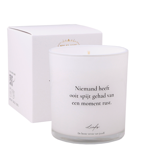Take a moment for yourself with the Fresh Cotton scented candle from My Flame Lifestyle x Liefs Official. This natural soy wax candle fills the room with a fresh, soft fragrance and features the quote: "Niemand heeft ooit spijt gehad van een moment rust." Perfect as a gift or to treat yourself. Sustainable, stylish, and inspiring for anyone who wants to relax and unwind.