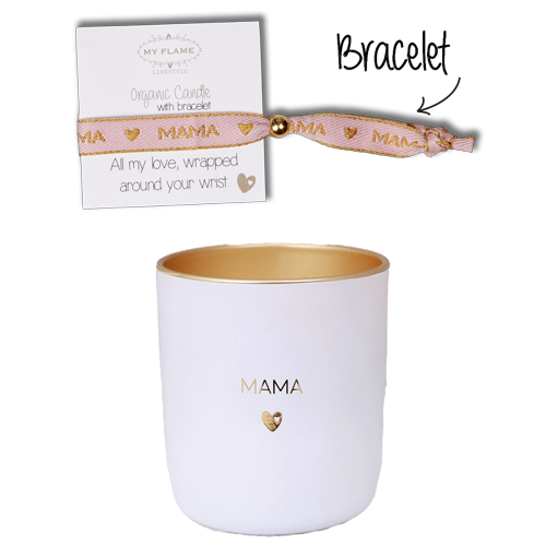 Een heerlijke geurkaars gemaakt van biologische sojawas. Deze kaars heeft de geur Fresh Cotton en brandt ca. 50 uur. Deze sojakaars wordt gesierd met de tekst 'Mama'. Een leuk detail aan deze kaars is dat het inclusief armbandje is met mama quote. Superleuk 2-in-1 cadeau voor Moederdag, verjaardag of zomaar voor de beste, liefste bonus moeder van de heeele wereld.